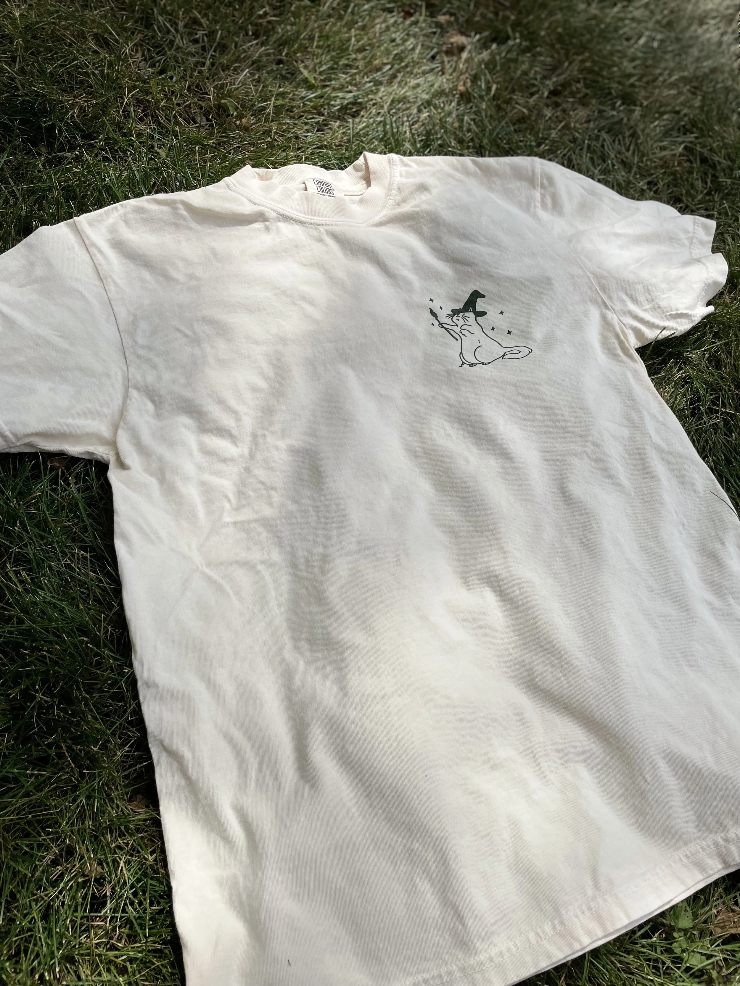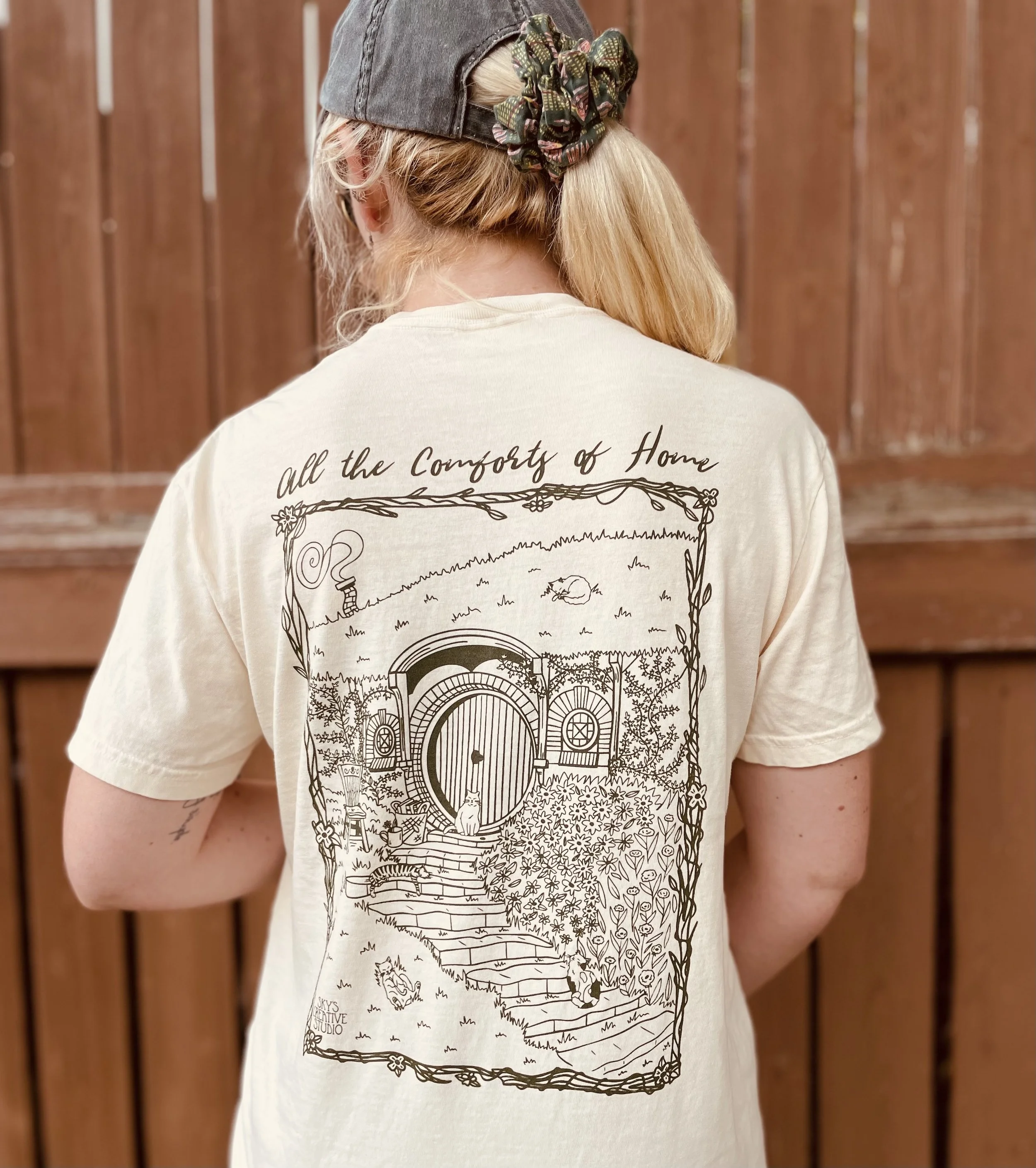 Pigment-dyed ivory Comfort Color tees. 100% ring-spun cotton, garment-dyed for that vintage, cozy, lived-in feel. Relaxed fit, rib collar, and shoulder-to-shoulder twill tape.